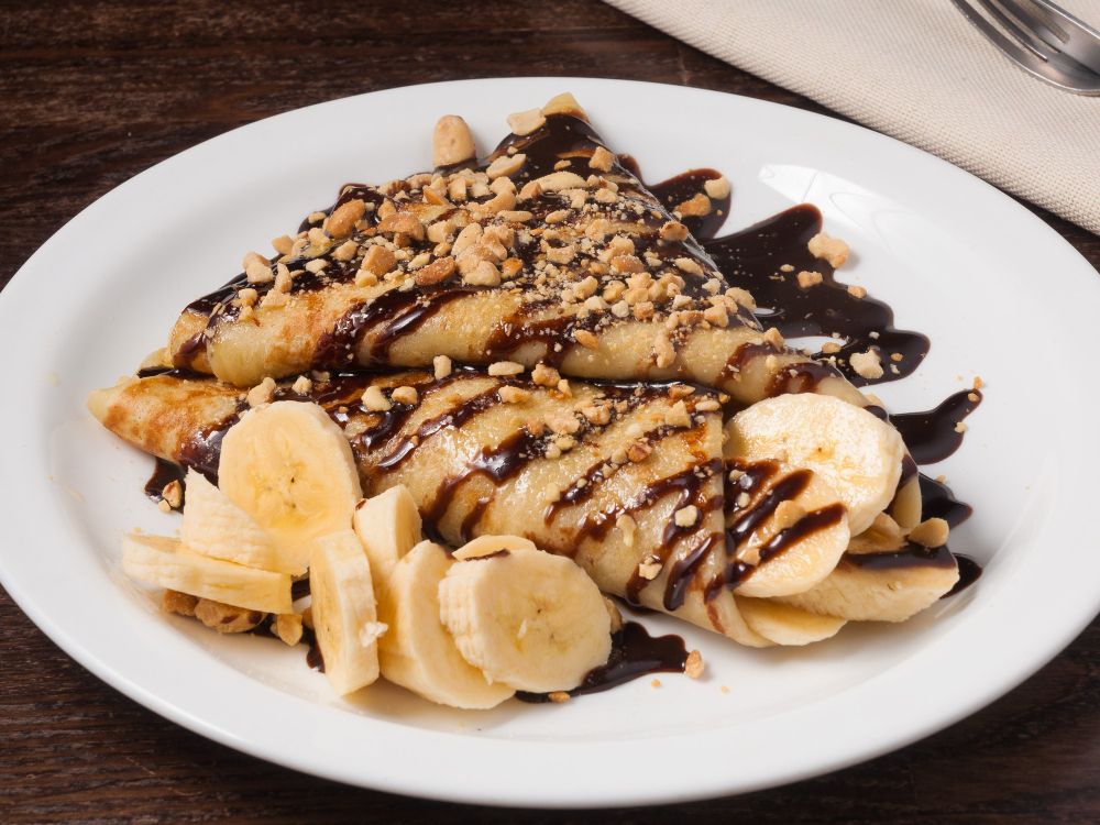 קרפ מטוגן, פריך וזהוב, במילוי פרוסות בננה רכות, קוקוס ורוטב שוקולד מפנק.